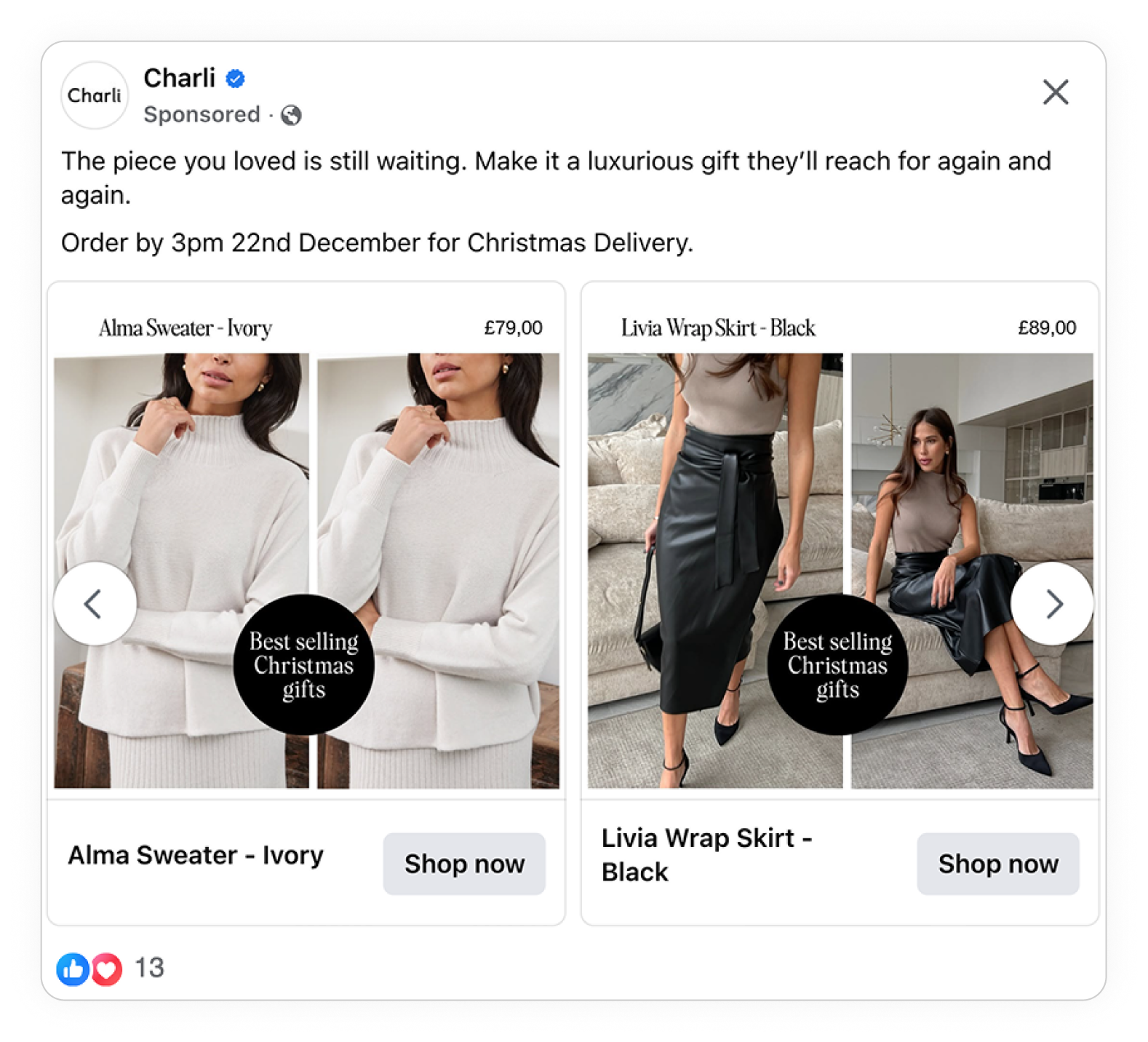 For this, they used Confect’s dynamic fields to embed seasonal urgency and contextual relevance into the ads. This included messages like: "Order within X days for delivery before Christmas” and other limited-time offers, which are proven and effective ways to persuade people to buy now, before it’s too late.