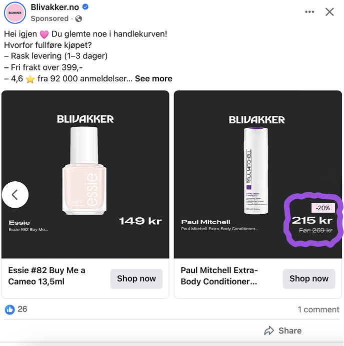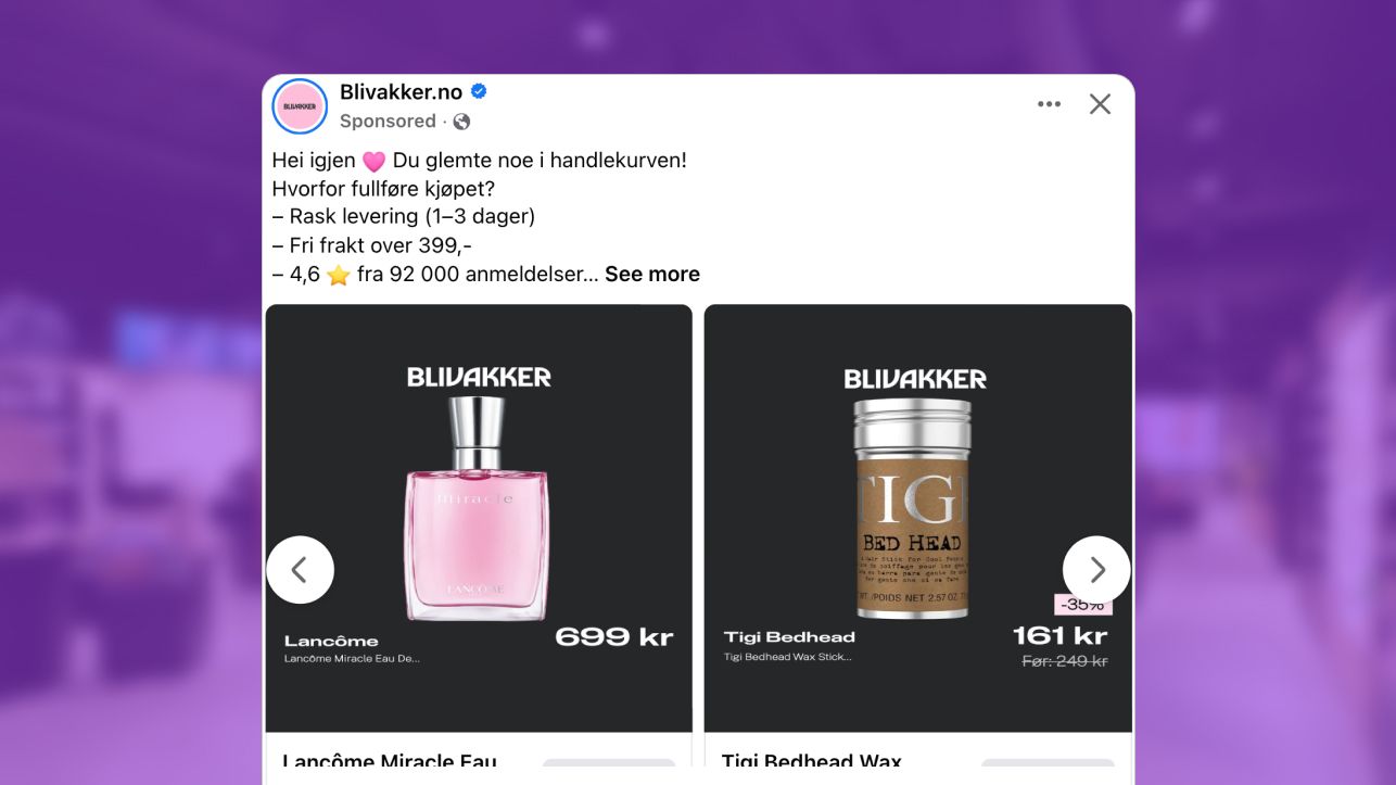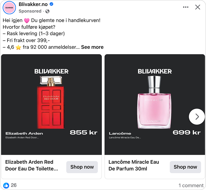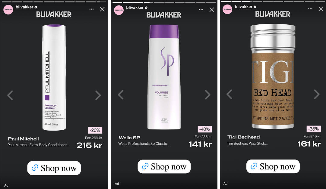 In this carousel ad by Blivvaker, the products are the starting point. The value message supports them, but never overshadows them. That order signals confidence. The brand is not relying on heavy persuasion. Instead, it lets the lineup of perfumes, creams, nail polishes, and other cosmetic products speak for itself.