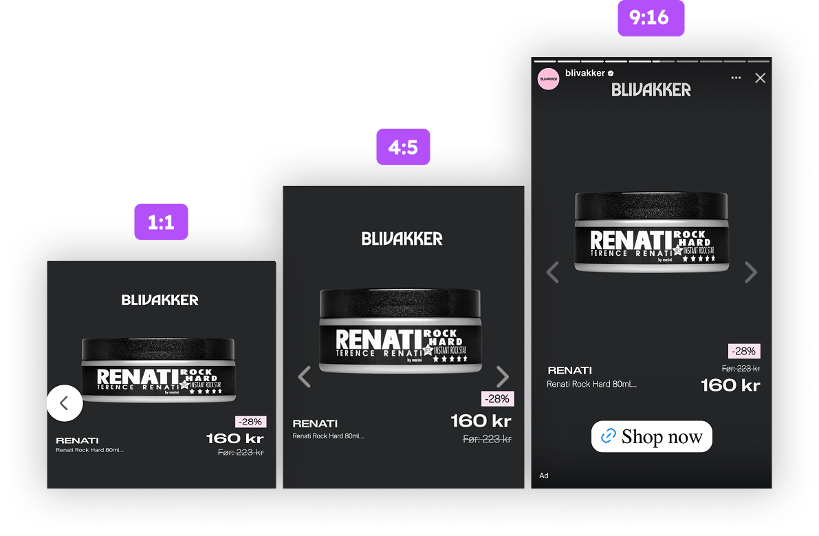 Because the layout structure is consistent and controlled through design rules, the same catalog ads can automatically adapt across formats without breaking the visual hierarchy.
