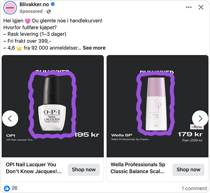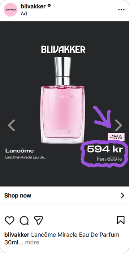 Even at a glance, viewers can see the stylish perfume bottles, the branding, price and discount, which is just one of the reasons why this ad achieved a +26% higher conversion rate and +28% higher ROAS.