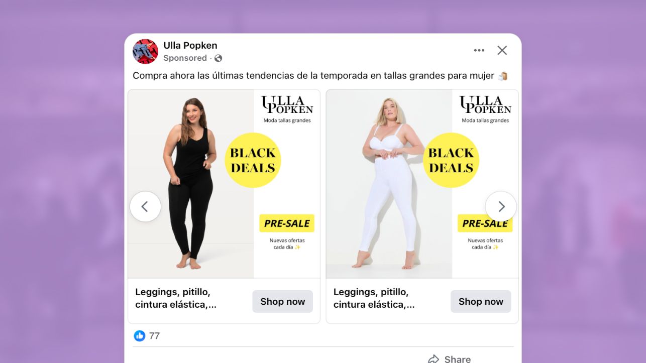 Popken’s ads show us that strong results aren’t accidental. Popken created an ad that used high-contrast colors, models and product shots, and a balanced layouts, which helped them achieve better returns than what they would have achieved with standard carousel ads.