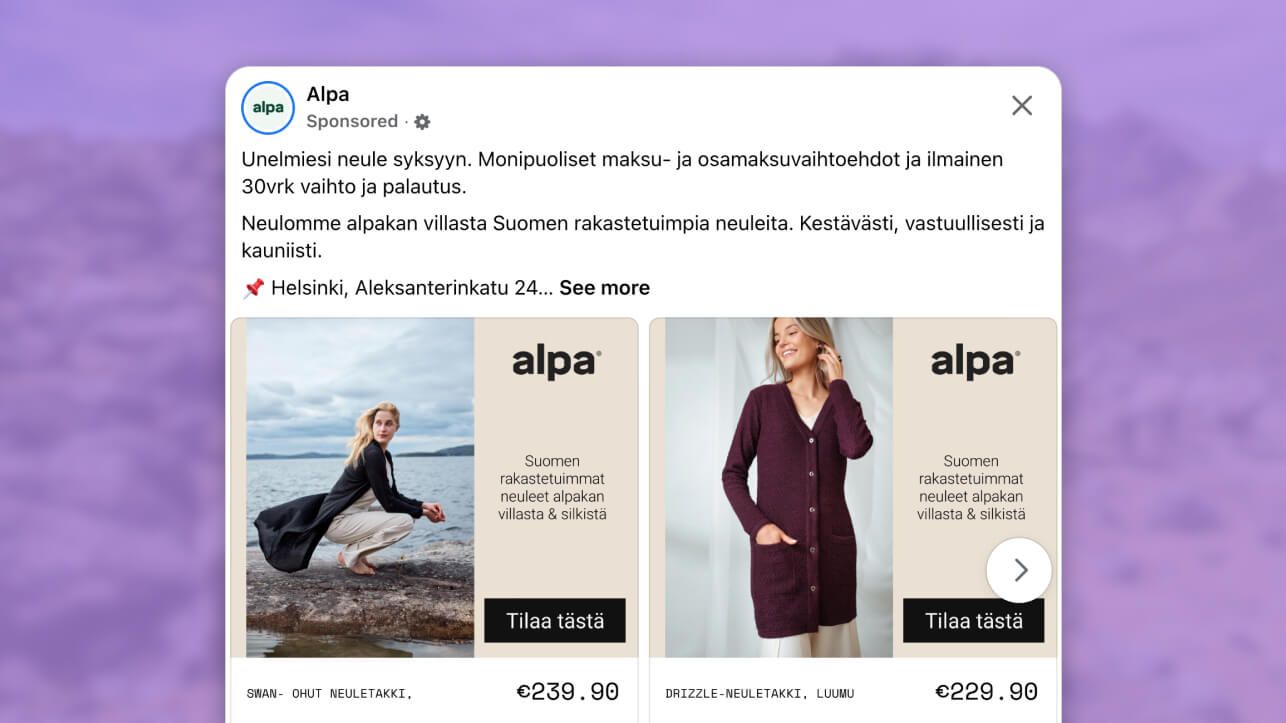 Alpa’s Catalog Ad campaign nailed a +43% ROAS because they took a strategic approach to designing the ads. They focused their designs on the things that matter most to potential customers (the look and feel of high-quality alpaca wool), and then crafted the rest of the ad experience around that.
