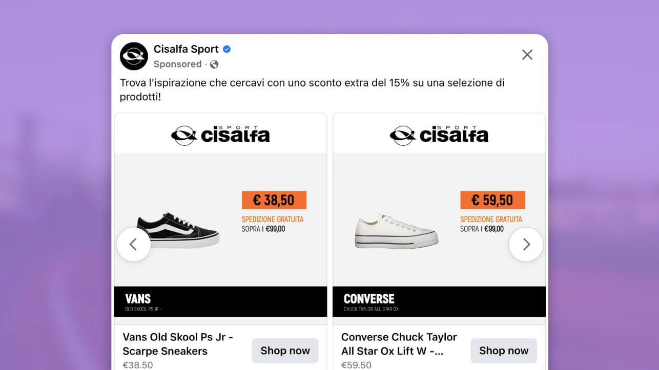 Cisalfa Sport is one of Italy’s leading omnichannel sports retailers, active in the development, production, sale, and distribution of sports and leisure apparel, footwear, and equipment, offering over 270 brands across around 170 stores with 3,800 people. It is part of Cisalfa Group, one of Europe’s top 10 sports retailers, operating in both Italy and Germany. One of the key factors that makes Cisalfa Sport more attractive to potential customers is its effective and smart use of Meta Catalog Ads.