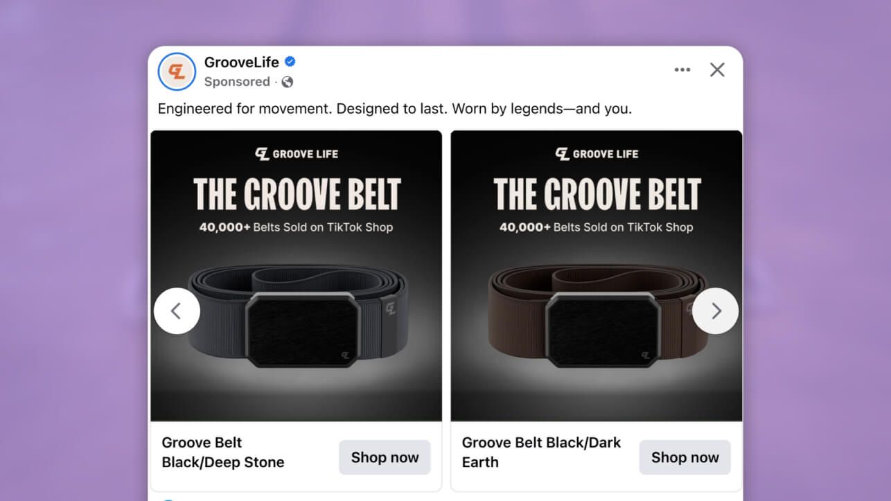 Then, on Facebook, they use the carousel format to target shoppers in the awareness or interest stage of the sales funnel (aka the discovery stage). By showcasing different color belts side by side, shoppers can easily compare their options.