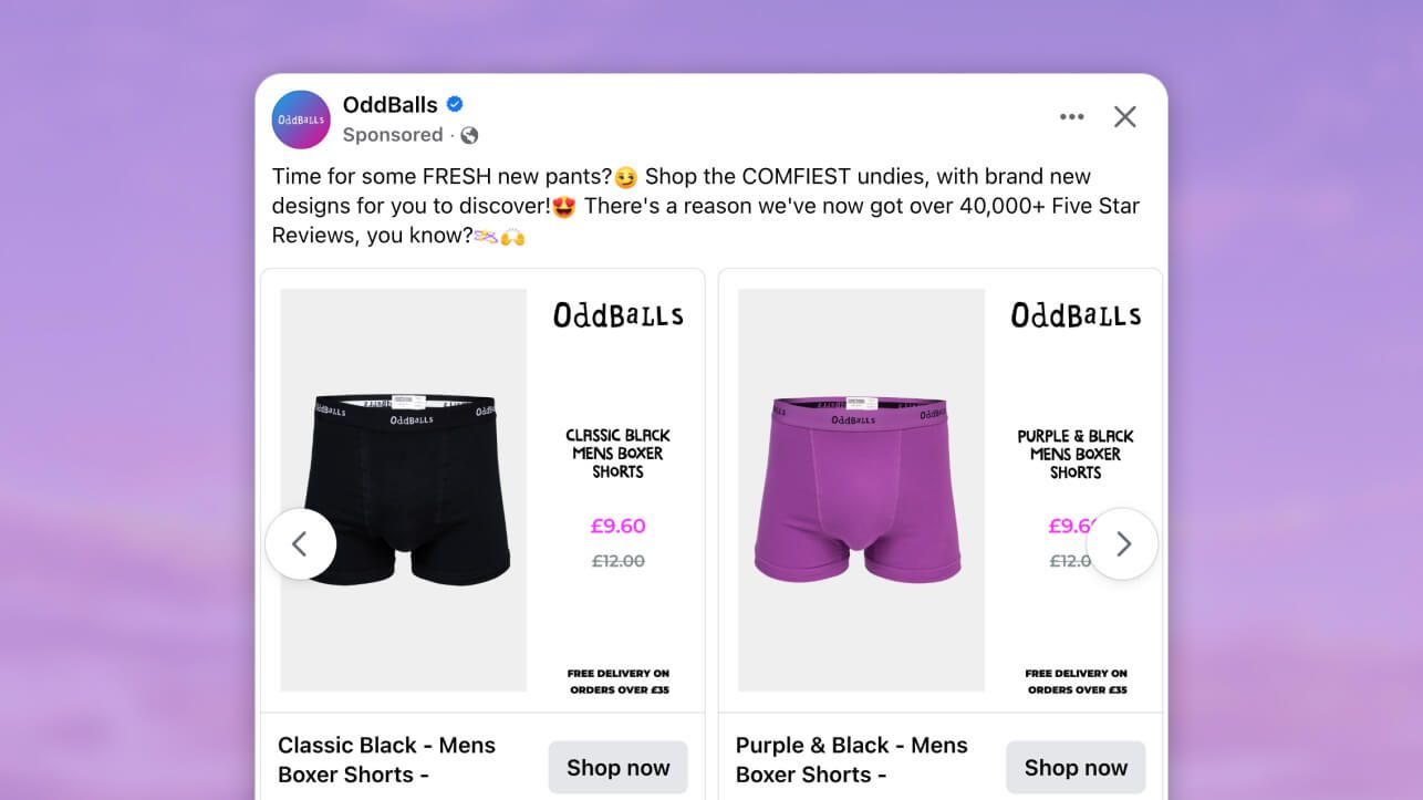 OddBalls’ Facebook and Instagram ads are great examples of how incorporating playfulness into your ads can make your target audience take you just as seriously. If your product offers value and comfort and you keep your branding consistent, your ads will build brand credibility (even if you’re different to your typical fashion brand).