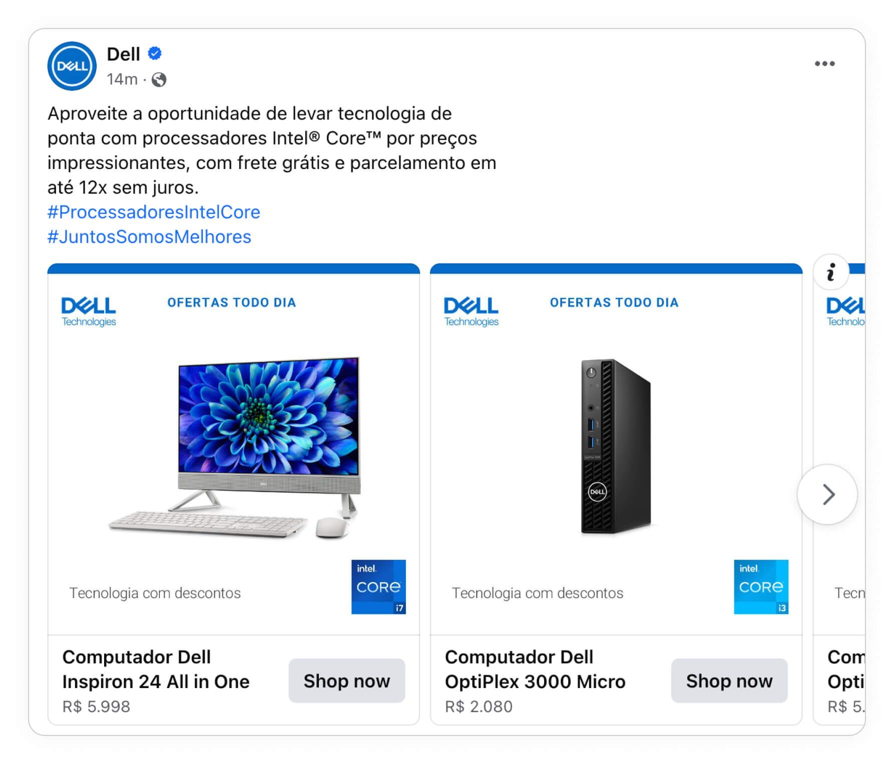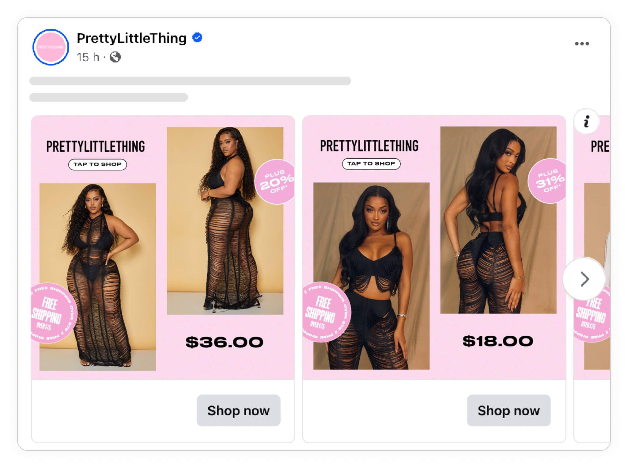 When running catalog ads on Meta platforms, users see a bunch of your products all in a single ad, just as if they were browsing through a physical copy of a store’s product catalog.