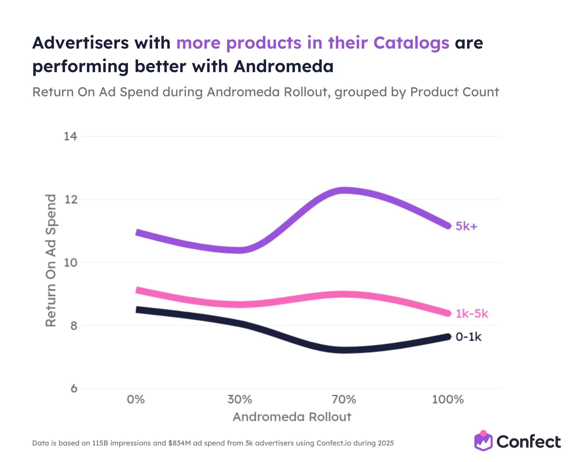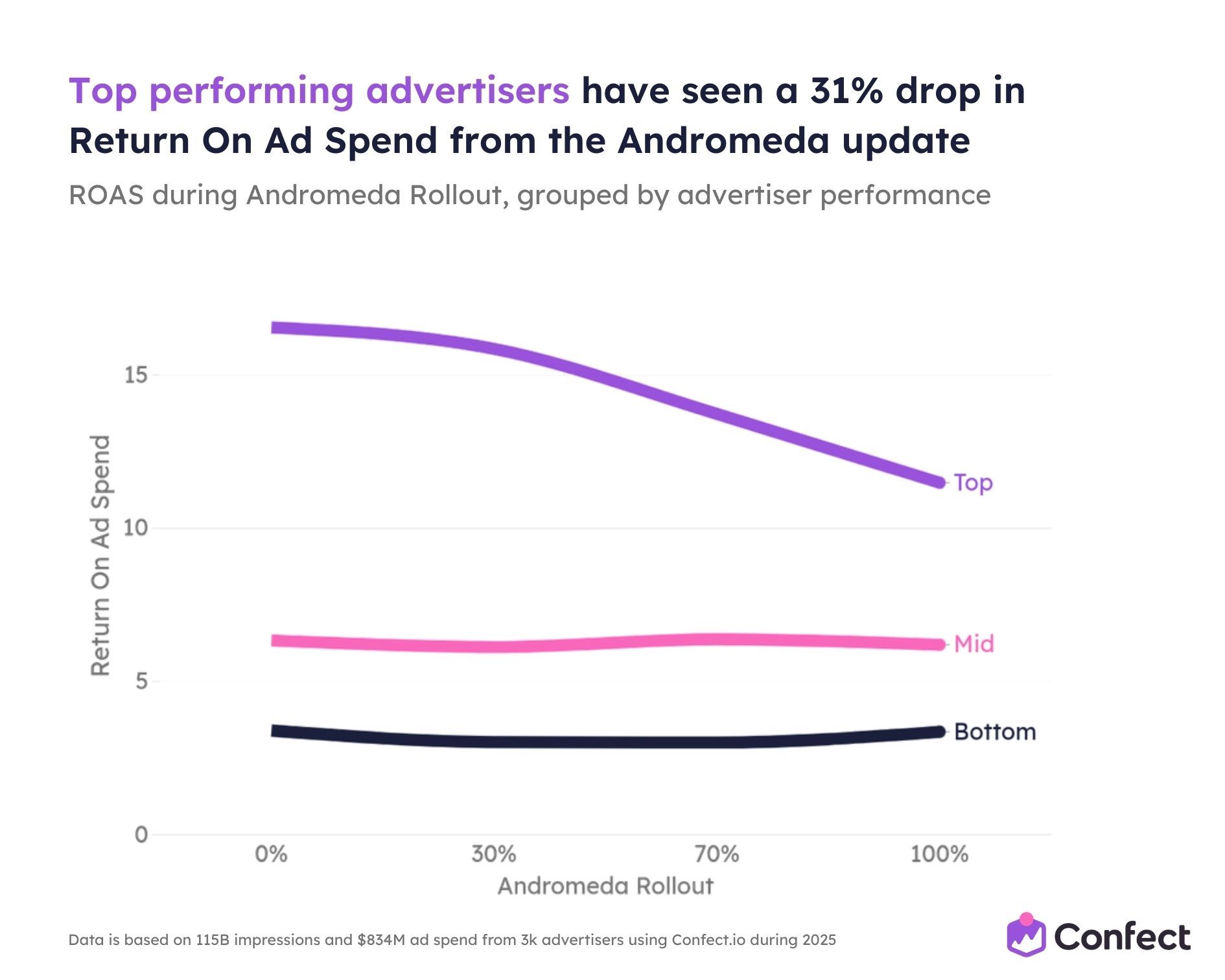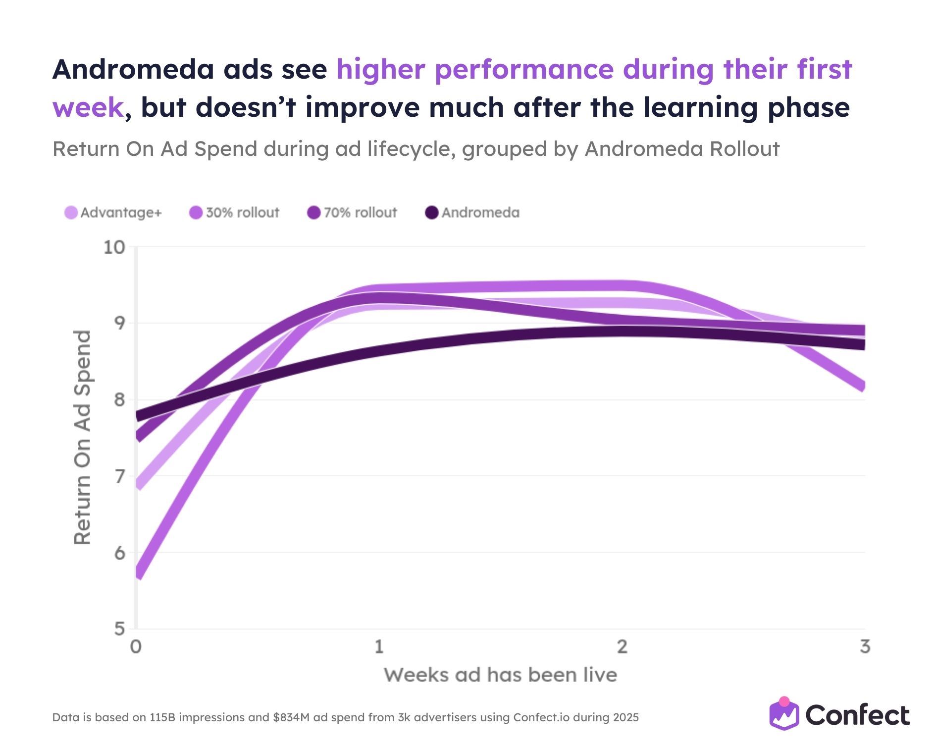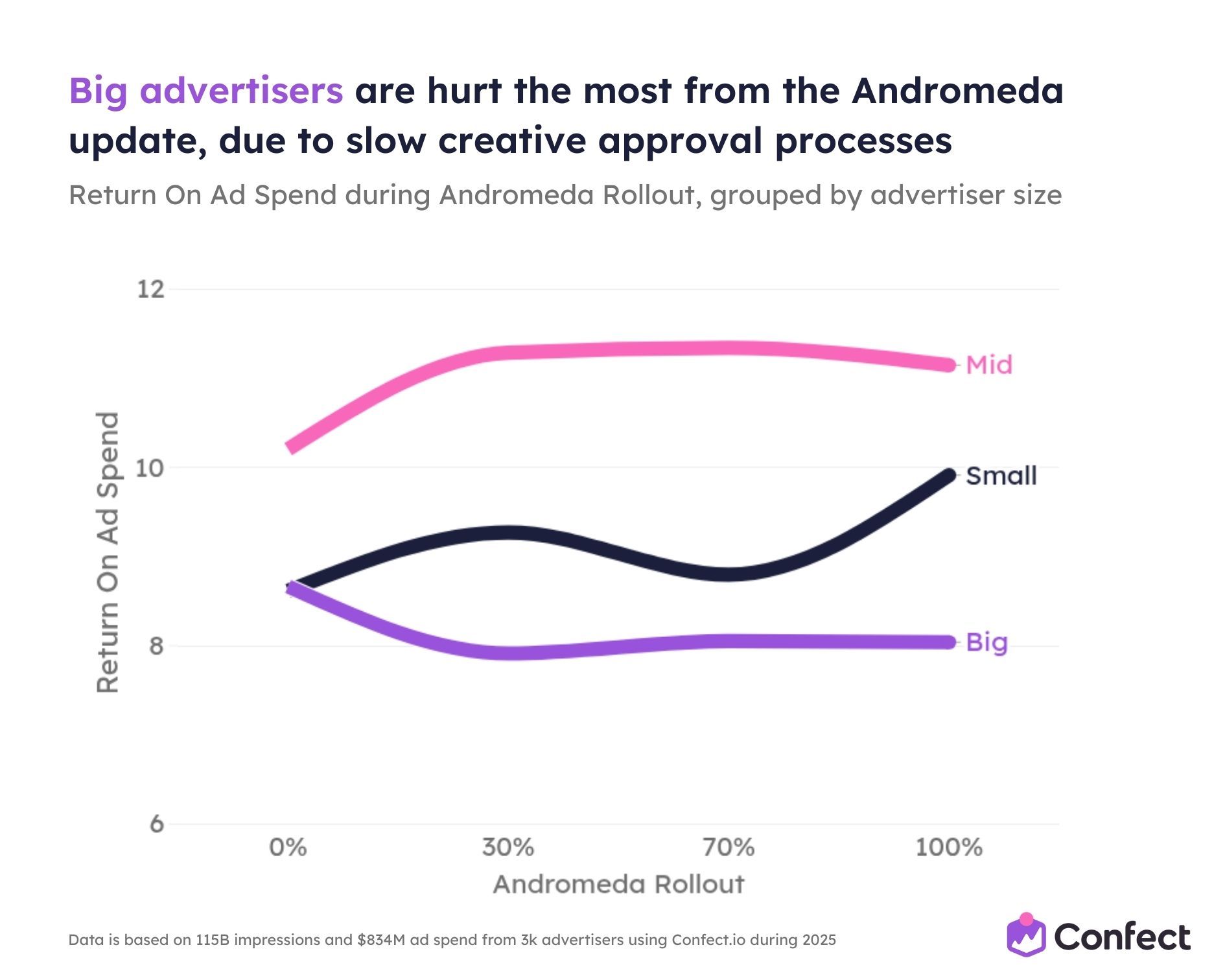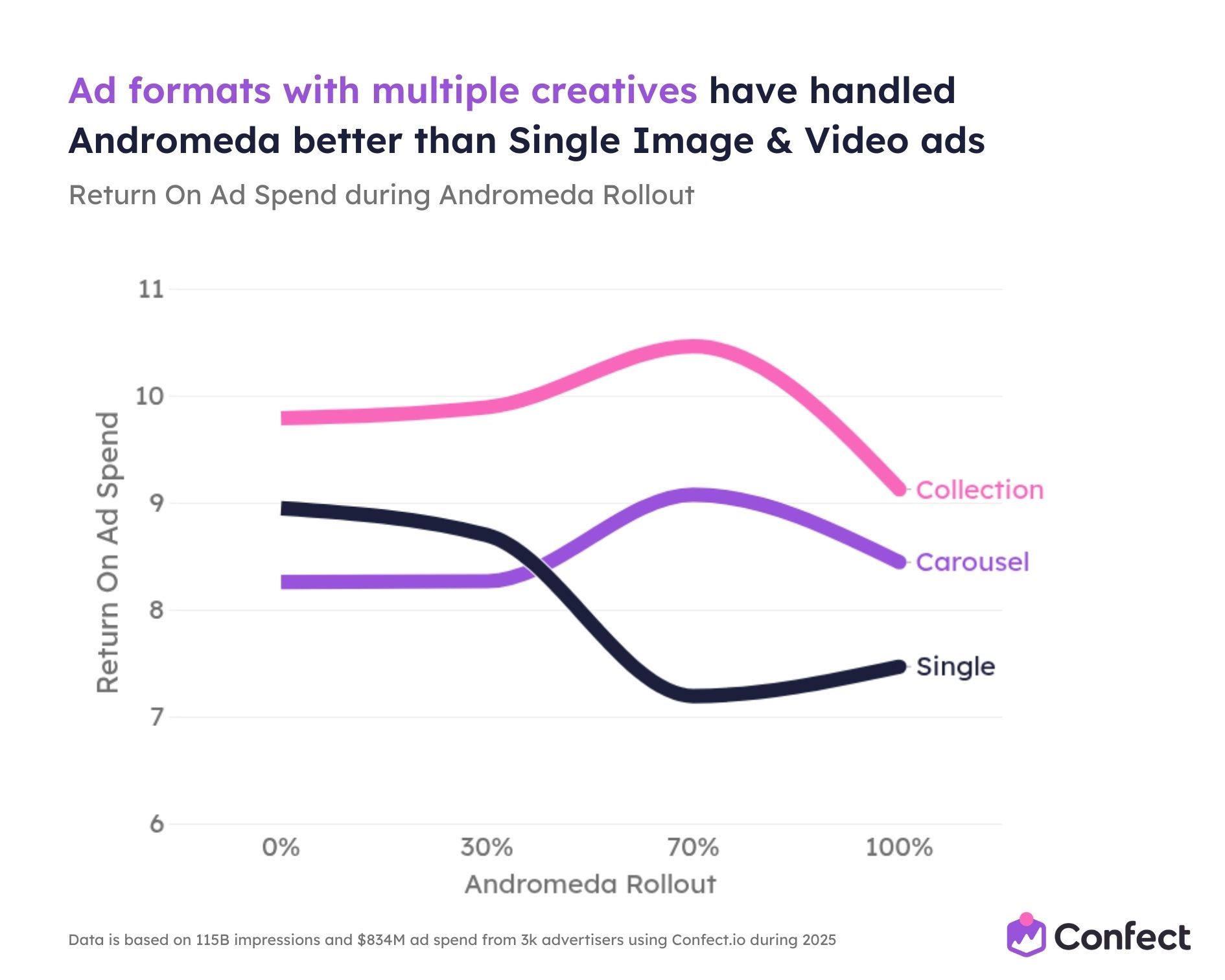 So we studied it. Across 3,014 eCommerce advertisers using Confect, covering $834 million in ad spend, 1 million ads, and 115.7 billion impressions during the full 2025 rollout period.