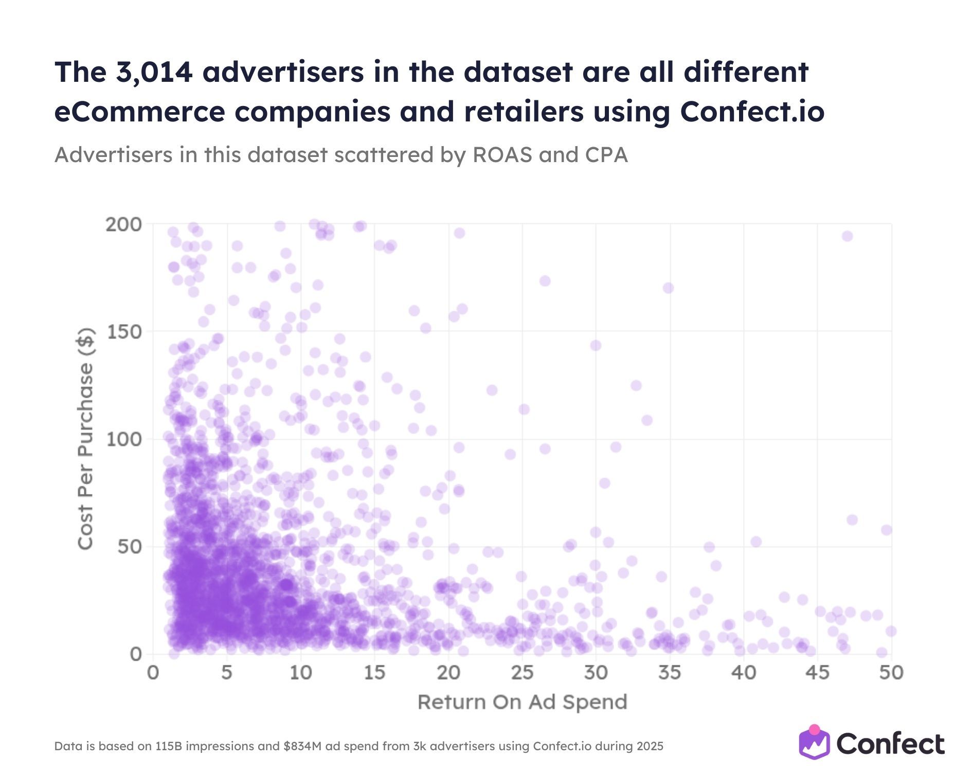The heaviest concentration sits between 2x and 10x ROAS with $20–$80 CPA. This is where the majority of typical eCommerce advertisers land, and where the study’s findings have the strongest statistical backing.