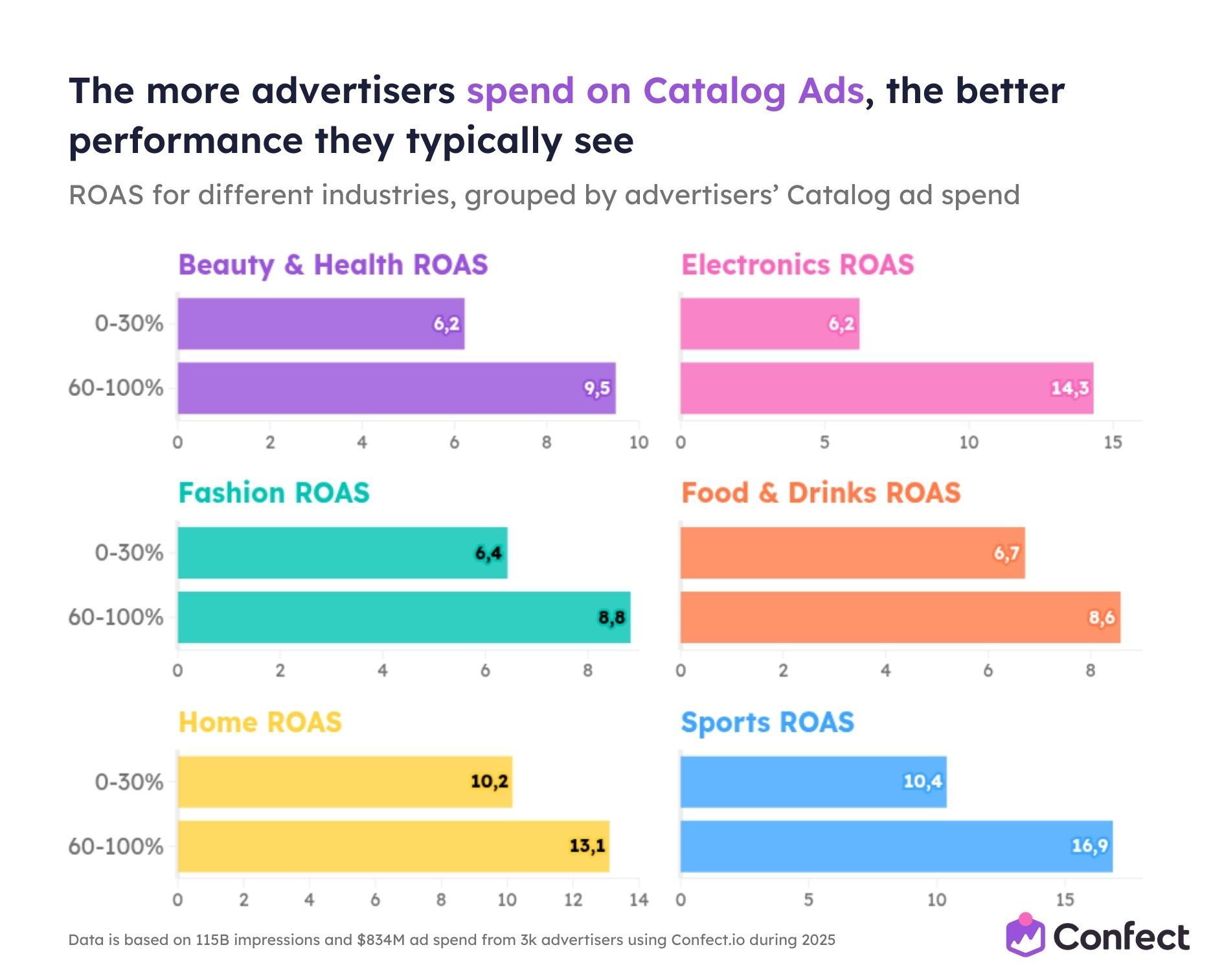 All advertisers in this study use Confect, which means they are all eCommerce companies running Catalog Ads. This makes the findings especially relevant for product-based businesses; but it’s worth noting when applying insights to non-eCommerce verticals.